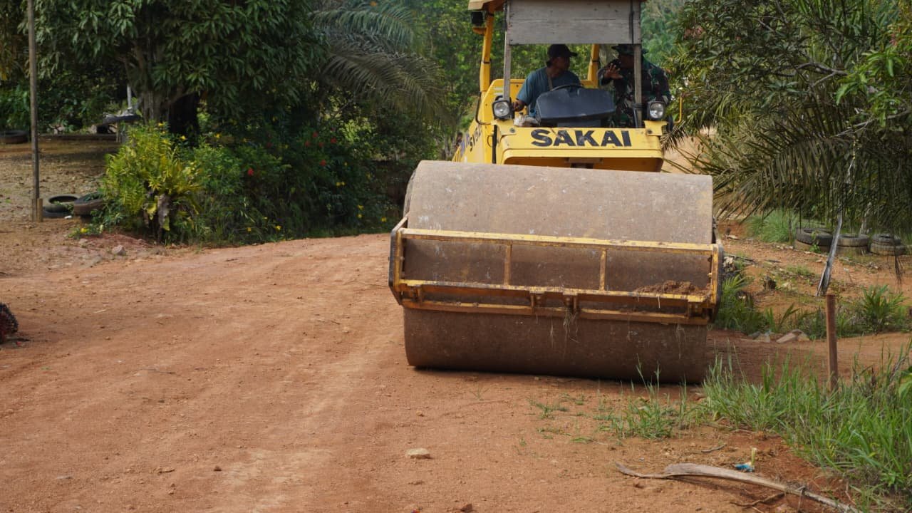 Kotawaringin Timur – Satgas TNI Manunggal Membangun Desa (TMMD) ke-127 terus berupaya memaksimalkan pembangunan infrastruktur di Desa Tri Buana. Pada Senin, 9 Maret 2026, mereka melakukan proses finishing pengerasan badan jalan dengan menggunakan alat berat bertipe boomag.