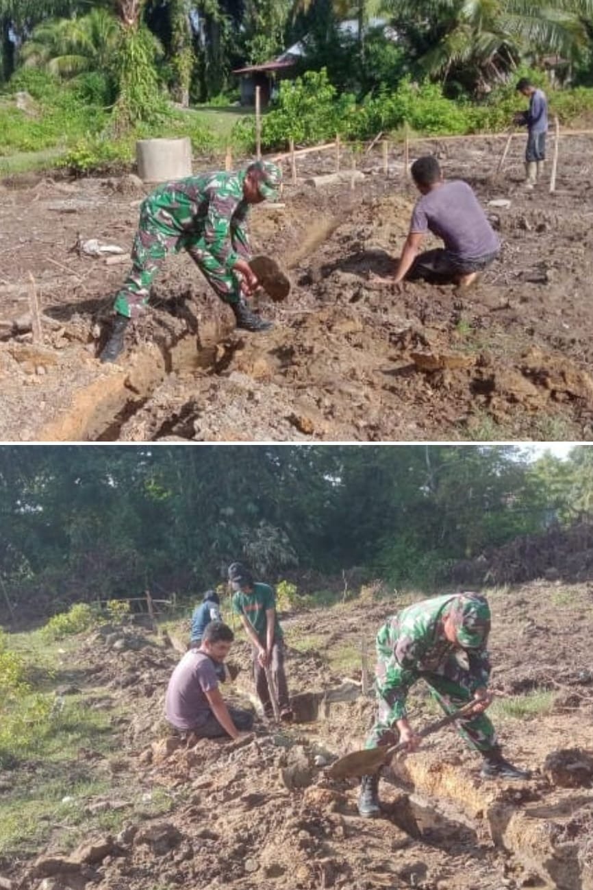 ACEH BARAT – Peningkatan produktivitas tanaman palawija, Babinsa Koramil 04/Mrb Kodim 0105/Abar, Serma Pujianto, membantu petani membuat saluran parit tersier di lahan pertanian yang berlokasi di Desa Ujong Tanjong, Kecamatan Meureubo, Kabupaten Aceh Barat, Rabu (7/1/2025).