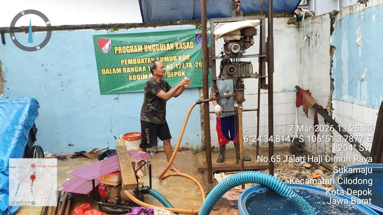 Depok – Pada hari ke-27 pelaksanaan Program TNI Manunggal Membangun Desa (TMMD) Ke-127 Tahun Anggaran 2026, Kodim 0508/Depok meraih pencapaian penting dalam penyediaan akses air bersih. Peristiwa ini terjadi pada Senin (09/03/2026) ketika salah satu proyek sumur bor berhasil selesai sepenuhnya.