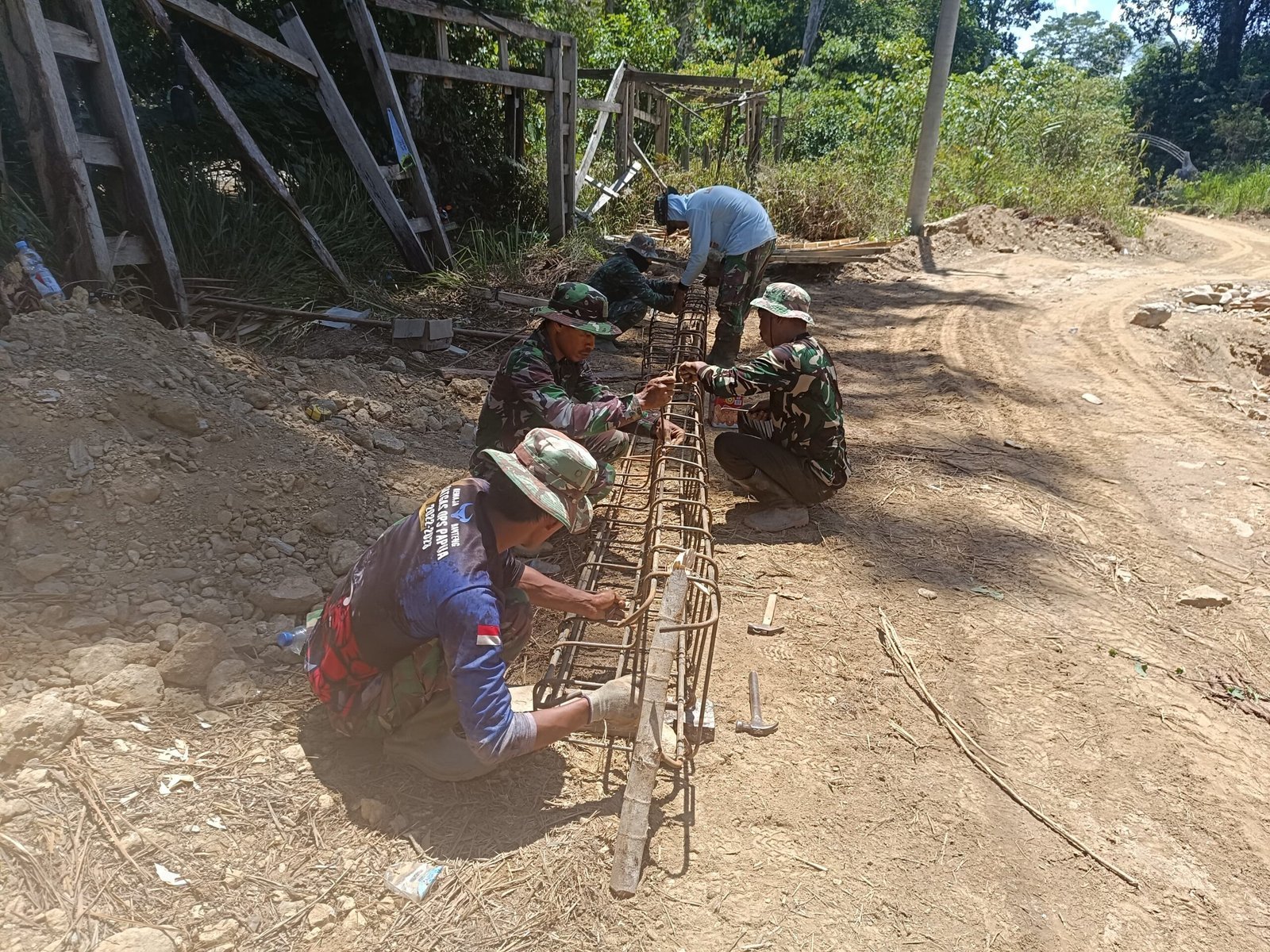 Proses perakitan besi ini dilakukan secara teliti agar hasilnya kuat dan mampu menahan beban jalan. Anggota Satgas dan masyarakat tampak kompak bekerja, saling membantu demi kelancaran pengerjaan.