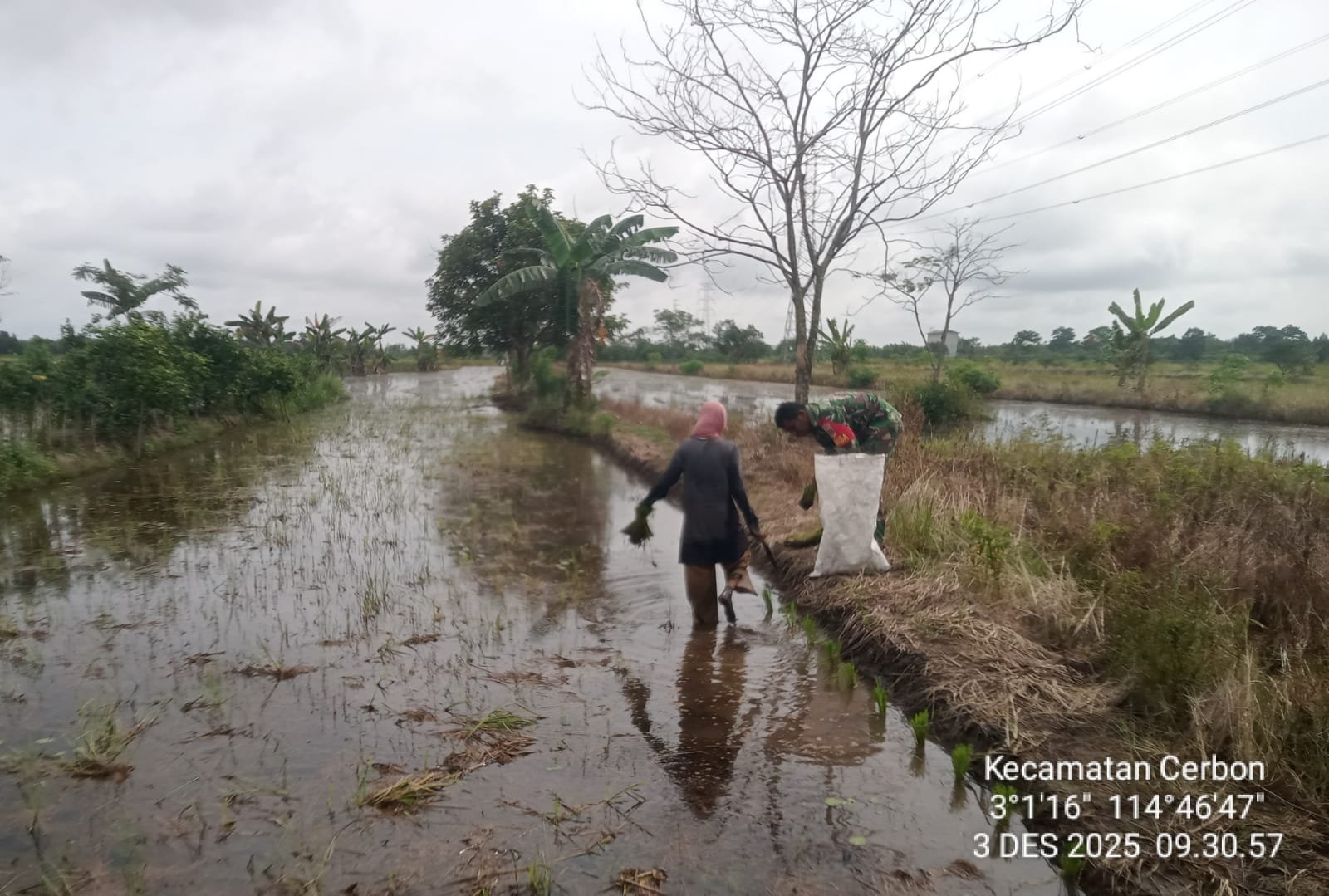 Barito Kuala — Dalam upaya mendukung program ketahanan pangan nasional dan meningkatkan produktivitas hasil pertanian di wilayah desa binaan, Babinsa Koramil 1005-04/Cerbon Serka Samsuddin, melaksanakan pendampingan kegiatan Luas Tambah Tanam (LTT) bersama para petani di Kecamatan Cerbon, Kabupaten Barito Kuala, pada Rabu, 3 Desember 2025.