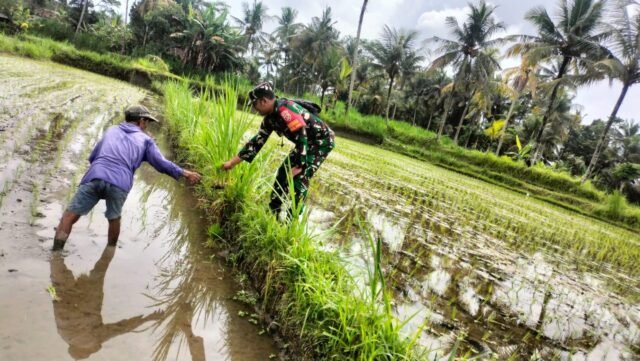 Pendampingan dilakukan di lahan milik warga, I Ketut Pande Ngade, dengan luas sekitar 1,60 hektare, menggunakan varietas Inpari 32 dan sistem tanam tagel. Kehadiran Babinsa tidak hanya memantau proses penanaman, tetapi juga memberikan arahan teknis dan motivasi kepada petani setempat.