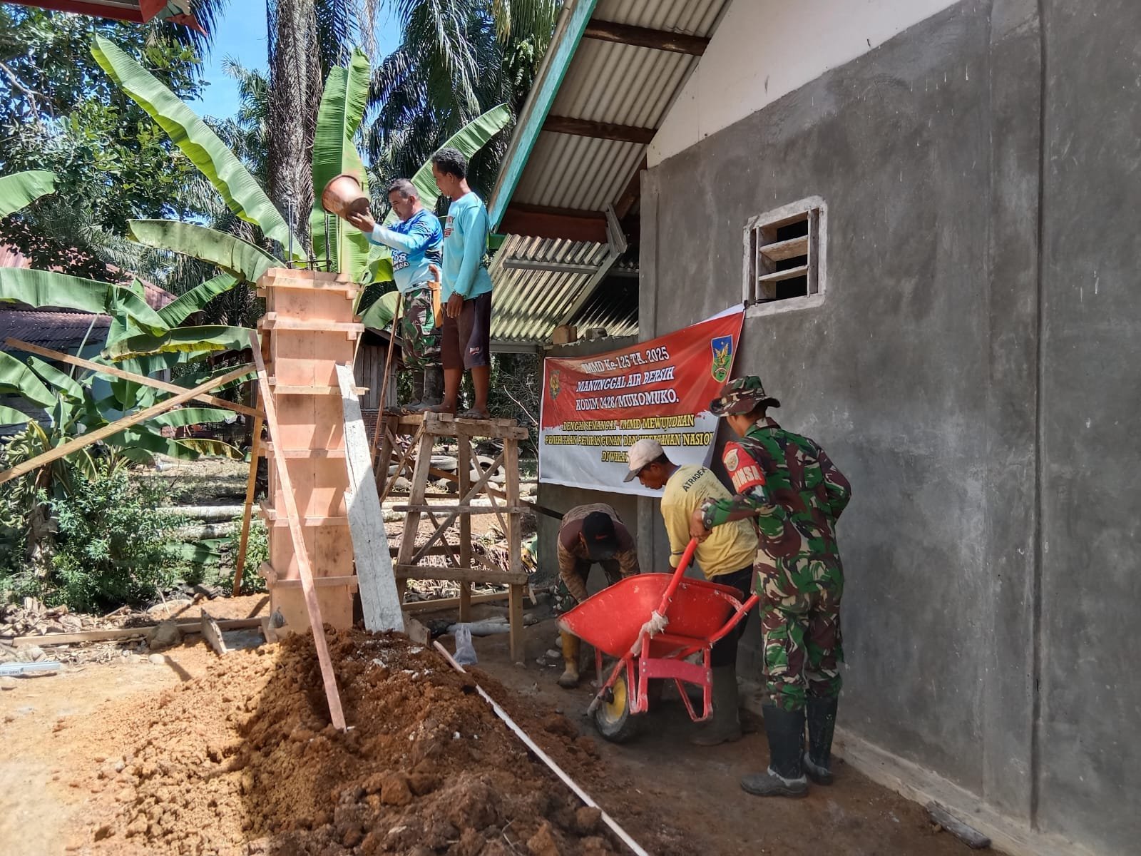 Setelah bekisting dan besi tulangan siap, proses pengecoran pun dimulai. Terlihat Satgas TMMD ke-125 Kodim 0428/Mukomuko secara perlahan menuangkan campuran cor ke dalam cetakan tiang penyangga toren air. Pekerjaan dilakukan hati-hati agar campuran semen masuk merata dan memadat sempurna.
