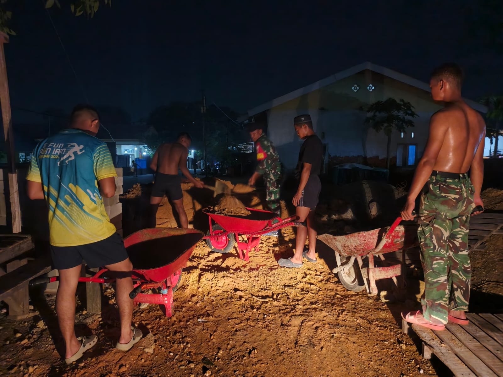 Menggunakan sinar lampu kendaraan sebagai sumber penerangan, para anggota Satgas terlihat bekerja sama dalam mengangkut serta menata berbagai material bangunan di lokasi proyek.