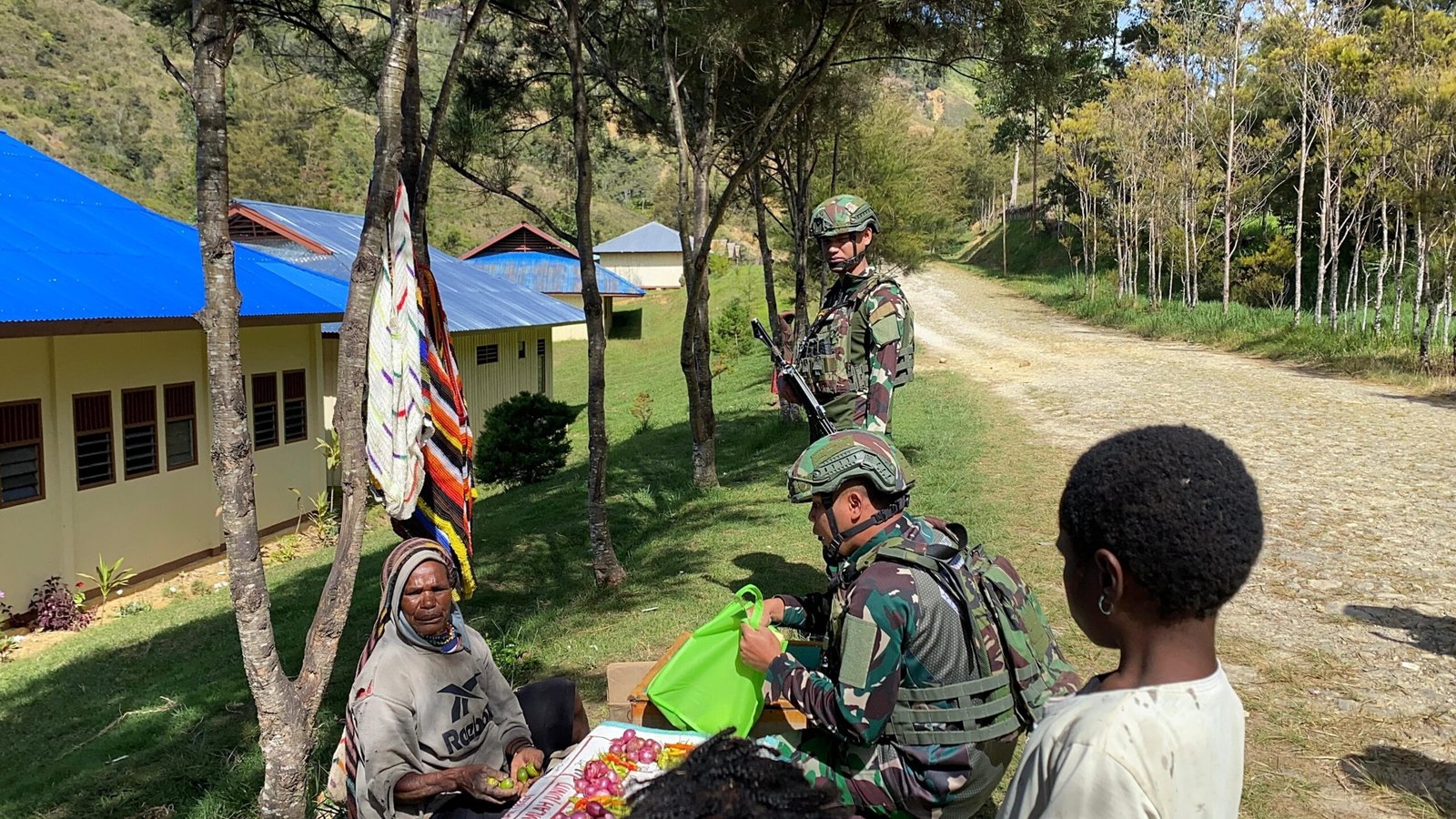 Dalam kegiatan Anjangsana, Personel Pos Malagai juga memberikan bantuan sembako kepada masyarakat Kampung Numbokawi, Distrik Malagai, Kabupaten Lanny Jaya, Papua Pegunungan, Jum’at (04/7/2025).