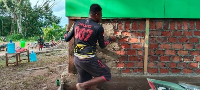 Pada Sabtu (01/11/2025), personel Satgas TMMD bersama warga Kampung Waropko bekerja melakukan perataan dinding menggunakan campuran semen dan pasir untuk memastikan struktur bangunan lebih kuat dan rapi. Tahap ini dikerjakan secara teliti agar hunian dapat memenuhi standar rumah layak huni.