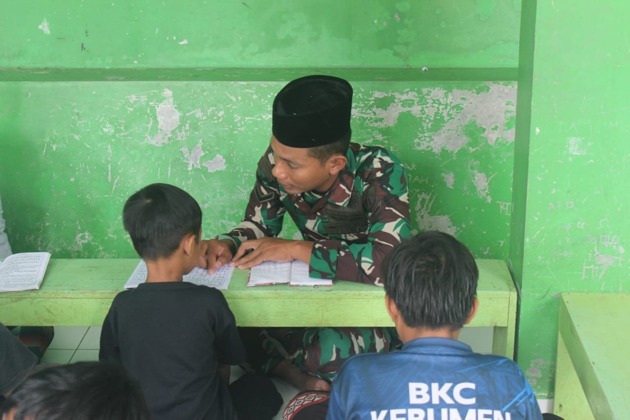 Dengan penuh ketelatenan, Serda Khairul M membimbing para santri dalam membaca huruf-huruf hijaiyah. Ia duduk bersila di antara anak-anak, mengarahkan pelafalan dengan sabar, menciptakan suasana pembelajaran yang hangat dan akrab. Kehadiran prajurit TNI di tengah para santri ini memberikan warna yang berbeda, terutama menjelang bulan suci Ramadhan.
