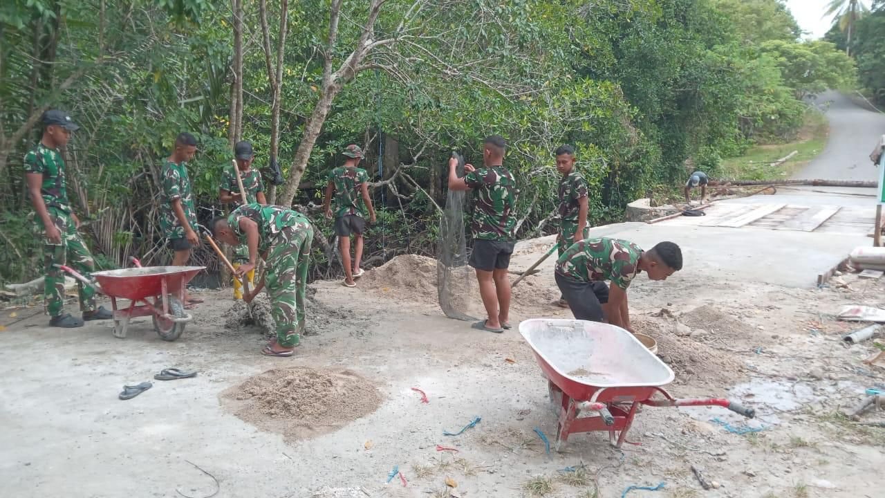 Kaimana – Program TNI Manunggal Membangun Desa (TMMD) ke-127 yang dilaksanakan oleh Kodim 1804/Kaimana menunjukkan kemajuan yang signifikan, terutama dalam pembangunan jembatan di Kampung Marsi, Distrik Kaimana, Kabupaten Kaimana. Pada hari Sabtu, 7 Maret 2026, Satgas TMMD berkolaborasi dengan masyarakat setempat melakukan pengecoran pada bagian ujung jembatan untuk meratakan pertemuan antara struktur jembatan dan badan jalan. Kegiatan ini dipimpin oleh Sertu Daniel Ndiken, Babinsa Kampung Marsi, yang mengerahkan personel terdiri dari 5 anggota TNI AD, 1 anggota TNI AL, dan 3 warga lokal. Melalui semangat gotong royong yang tinggi, pekerjaan ini berhasil dilaksanakan dengan baik dan menunjukkan perkembangan yang positif. Saat ini, progres pembangunan jembatan telah mencapai sekitar 95 persen. Dengan hampir selesainya tahap ini, diharapkan jembatan yang dibangun lewat program TMMD ini dapat segera digunakan oleh masyarakat, sehingga memperlancar akses transportasi dan aktivitas sehari-hari di Kampung Marsi.