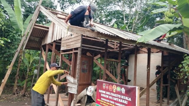 BARITO KUALA – Deru palu dan suara seng berjatuhan terdengar bersahutan di Desa Tumih, Kecamatan Wanaraya. Sejumlah prajurit TNI dari Satuan Tugas TNI Manunggal Membangun Desa (TMMD) Ke-126 Kodim 1005/Barito Kuala tampak sibuk menurunkan lembaran seng tua dan melepas papan dinding rumah milik Zaini, warga setempat, yang menjadi sasaran program rehabilitasi Rumah Tidak Layak Huni (RTLH).