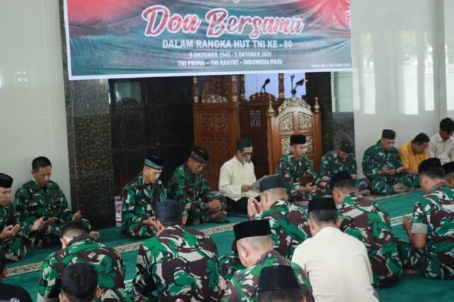 TAKALAR – Wujud syukur menyambut HUT TNI ke-80 Tahun 2025, Prajurit dan keluarga besar Kodim 1426/Takalar gelar do’a bersama bertempat di Masjid Al Aras Makodim Jalan Fitrah Nomor 9 Kelurahan Kalabbirang Kecamatan Pattallassang Kabupaten Takalar. Sabtu (04/10/2025).