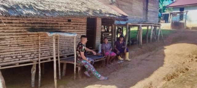 Suasana hangat tampak saat anggota Satgas duduk bersama warga di teras rumah dan warung kecil sambil berbagi cerita seputar kegiatan TMMD maupun kehidupan sehari-hari.