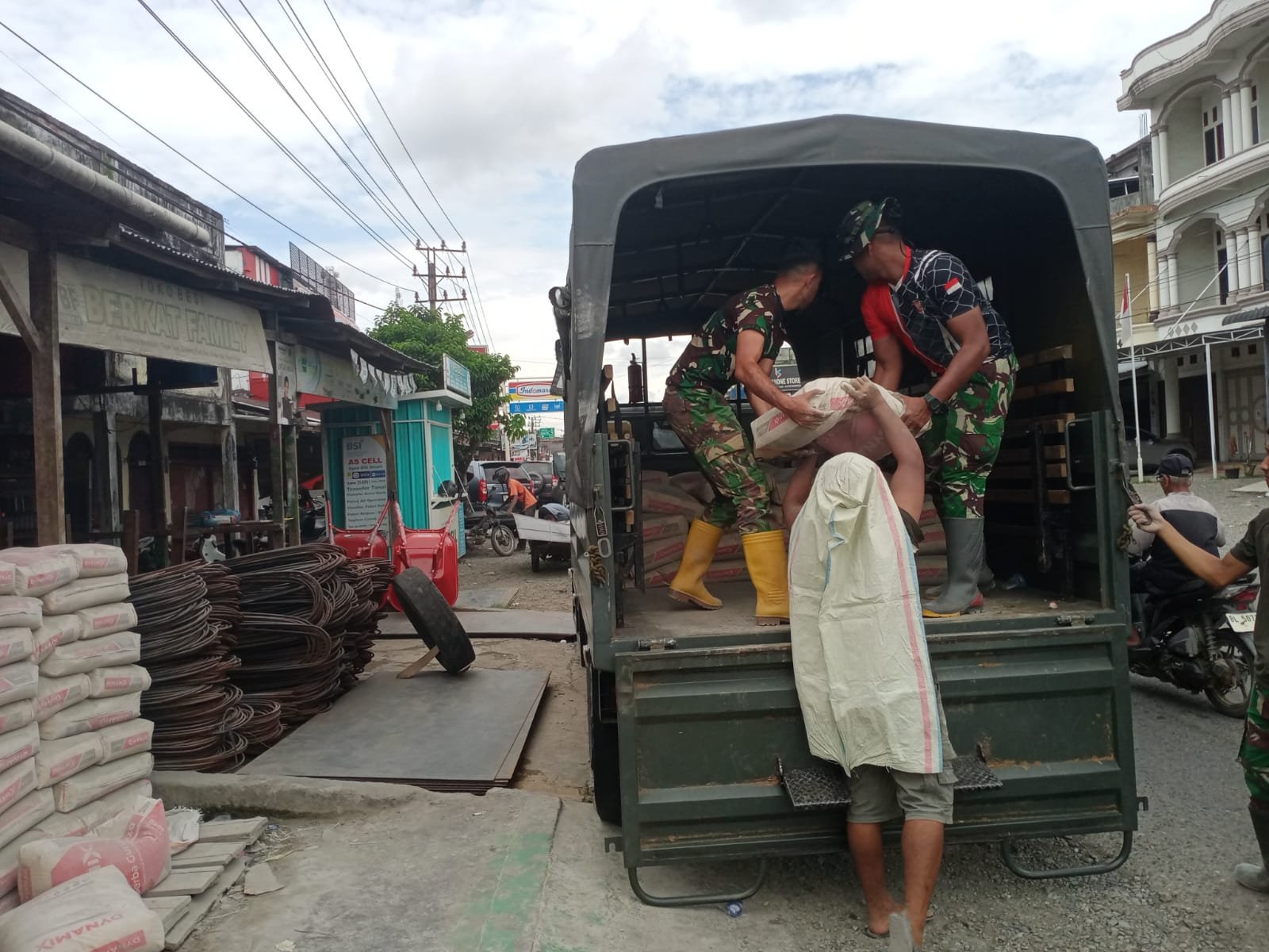 NAGAN RAYA – Percepatan pembangunan di lokasi program TNI Manunggal Membangun Desa (TMMD) Ke-127 yang dilaksanakan oleh Kodim 0116/Nagan Raya terus dilakukan melalui pendistribusian material bangunan, khususnya semen, ke titik-titik pekerjaan di Desa Ujong Blang, Kecamatan Beutong, Kabupaten Nagan Raya.
