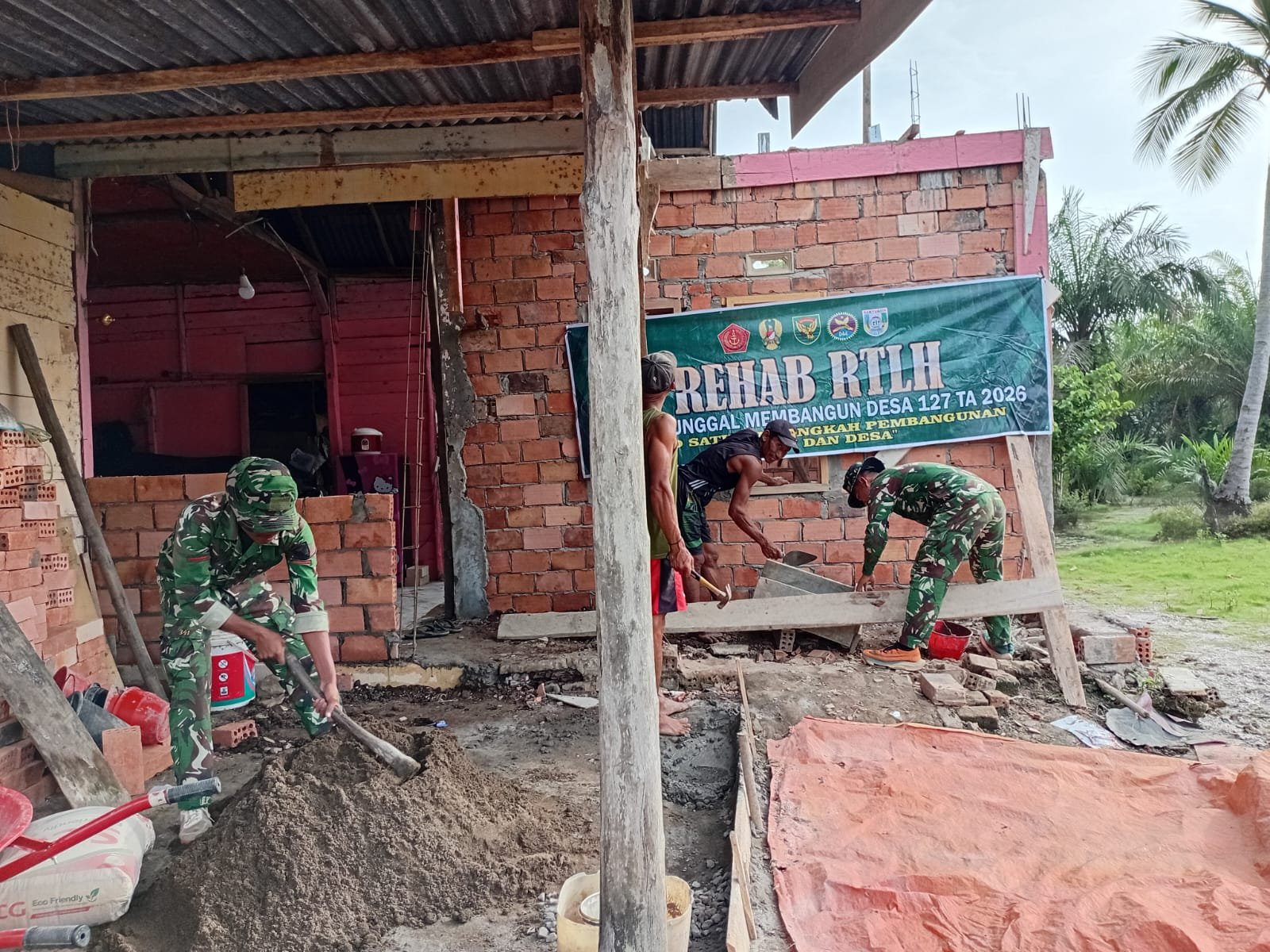 Banyuasin – Pembangunan rumah tidak layak huni (RTLH) milik Bapak Paiman semakin dipercepat oleh Satgas TMMD 127 yang berasal dari Kodim 0430/BA. Dalam proses ini, anggota Satgas bekerja sama dengan warga Desa Wonosari untuk melakukan pemasangan tebeng layar pada bangunan tersebut.