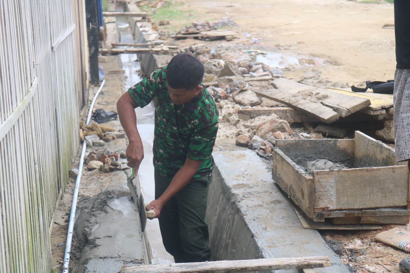 Suasana gotong royong terlihat dengan jelas saat para prajurit berkolaborasi untuk memastikan setiap bagian saluran terpasang dengan rapat dan permukaannya rata dengan sempurna.
