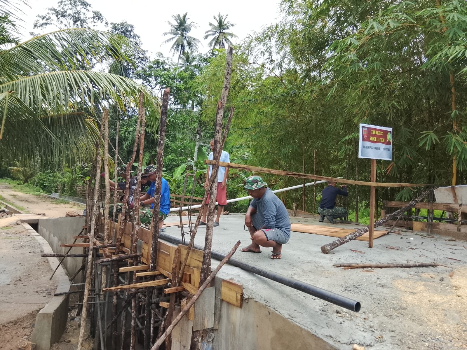 KENDARI – Proyek pembangunan jembatan yang merupakan bagian dari program Tentara Manunggal Membangun Desa (TMMD) ke-127 di Kelurahan Sambuli terus mengalami kemajuan pesat. Pada Sabtu (28/2), anggota Satgas dari Kodim 1417/Kendari fokus menyelesaikan proses persiapan untuk pemasangan sandaran jembatan dengan merakit cetakan beton yang akan mendukung rangka besi pengaman.