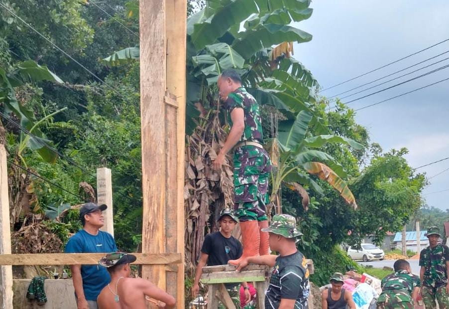 Anggota Satgas terlihat bekerja sama dengan masyarakat setempat untuk memasang tiang mal, yang merupakan tahapan awal dalam pembangunan fasilitas Mandi Cuci Kakus (MCK). Kegiatan ini dilakukan dengan penuh kehati-hatian agar struktur yang dibangun dapat berdiri stabil dan aman untuk digunakan oleh warga.