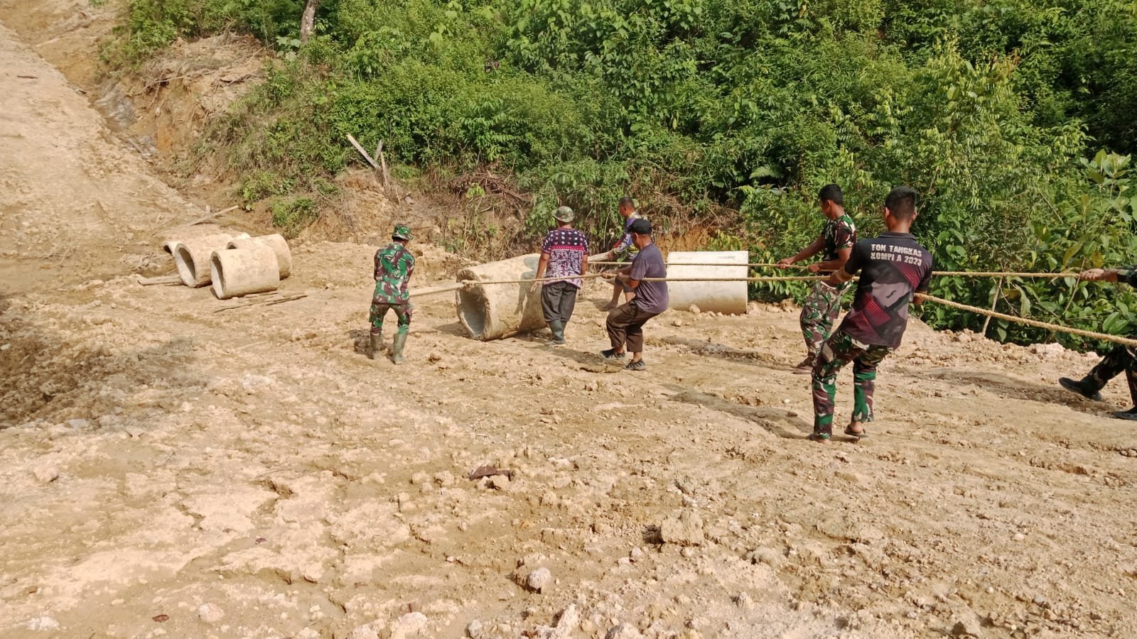 Didorong bersama oleh personel Satgas TMMD Ke-127 Kodim 0116/Nagan Raya, material tersebut digulingkan menuju lokasi pemasangan di jalur pembangunan jalan Desa Ujong Blang menuju Desa Pante Ara Kecamatan Beutong, Sabtu (7/3/2026).