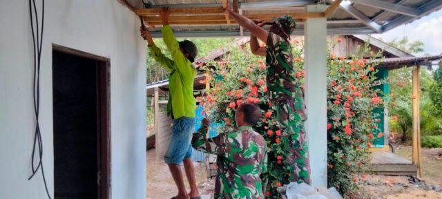 Terlihat para anggota Satgas TMMD bersama warga bahu-membahu melakukan pemasangan kerangka plafon di bagian teras mushola. Semangat gotong royong pun tampak jelas dalam setiap tahapan pekerjaan, mencerminkan kemanunggalan TNI dengan rakyat.