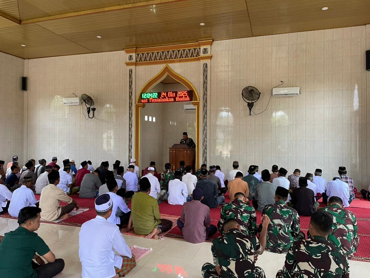 Dalam kesempatan tersebut, Sertu Samingan, salah satu anggota Satgas TMMD, bertindak sebagai khatib Jum’at. Dalam khutbahnya, ia mengajak jamaah untuk selalu memperkuat keimanan dan menanamkan nilai-nilai gotong royong dalam kehidupan bermasyarakat.