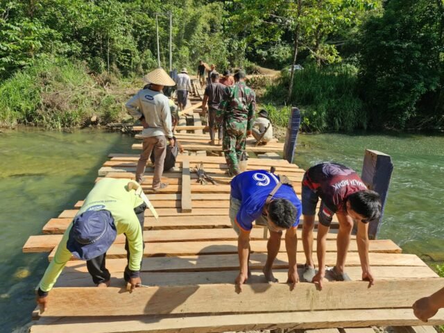 Anggota Satgas TMMD dengan penuh kehati-hatian melakukan pemasangan papan lantai jembatan menggunakan peralatan sederhana. Mereka memastikan setiap bagian terpasang kuat dan rapi agar jembatan dapat dilalui dengan aman oleh masyarakat maupun kendaraan pengangkut hasil pertanian.
