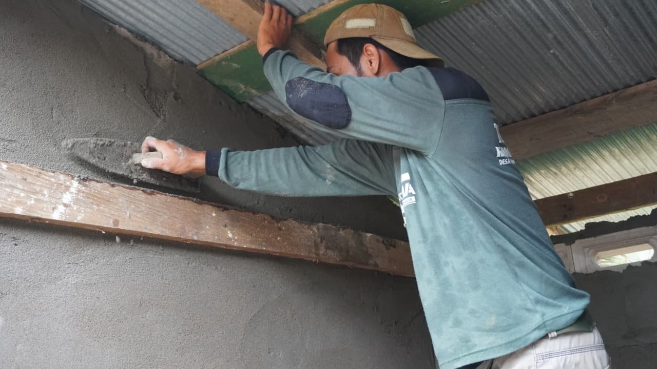 Sejak pagi, tampak para anggota TNI bersama penduduk desa bekerja sama dalam mengaduk semen dan meratakan plester di dinding bangunan MCK. Proses ini merupakan bagian krusial dalam penyempurnaan konstruksi sebelum memasuki tahap finishing.
