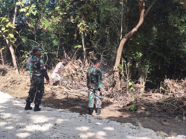 NTT-KUPANG, — Menjelang penutupan program TNI Manunggal Membangun Desa (TMMD) Ke-124, Satgas TMMD Kodim 1604/Kupang bersama masyarakat Desa Haulelot melaksanakan kegiatan pembersihan jalan sepanjang 1,4 kilometer yang telah dibuka selama pelaksanaan TMMD. Kegiatan ini dilakukan sebagai bentuk kesiapan menjelang peresmian jalan yang direncanakan pada 4 Juni 2025.