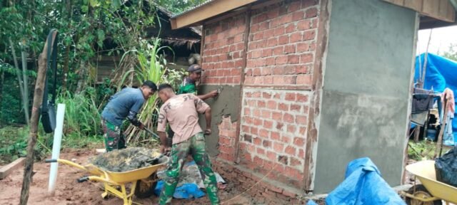 Kegiatan ini dilakukan untuk memperkuat struktur bangunan dan memperhalus permukaan dinding sebelum tahap acian dan pengecatan. Dengan komposisi adukan semen dan pasir yang pas, para prajurit Satgas bekerja dengan penuh ketelitian agar hasil akhir kokoh, rapi, dan tahan lama.