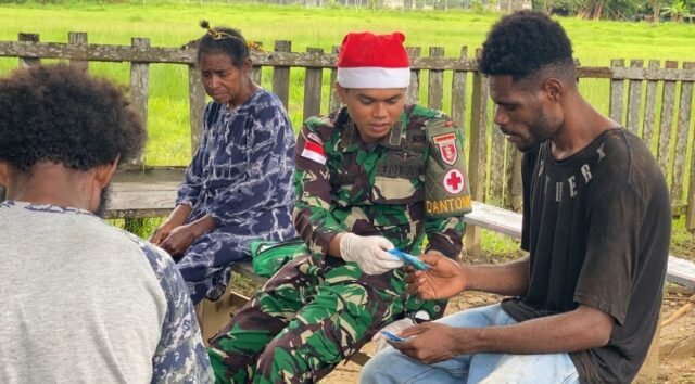 MEMBERAMO RAYA – Personel kesehatan Pos Dabra Satgas Yonif 614/RJP yang dipimpin oleh Wadanpos Letda Ckm Boby memberikan pelayanan kesehatan kepada warga kampung Dabra, salah satu warga Bapak Benyamin (48) yang datang ke Pos Dabra, Distrik Memberamo Hulu, Kabupaten Memberamo Raya, Papua. Bapak Benyamin datang ke Pos Dabra untuk mendapatkan perawatan atas keluhan batuk dan demam yang dideritanya, Sabtu (28/12/2024).
