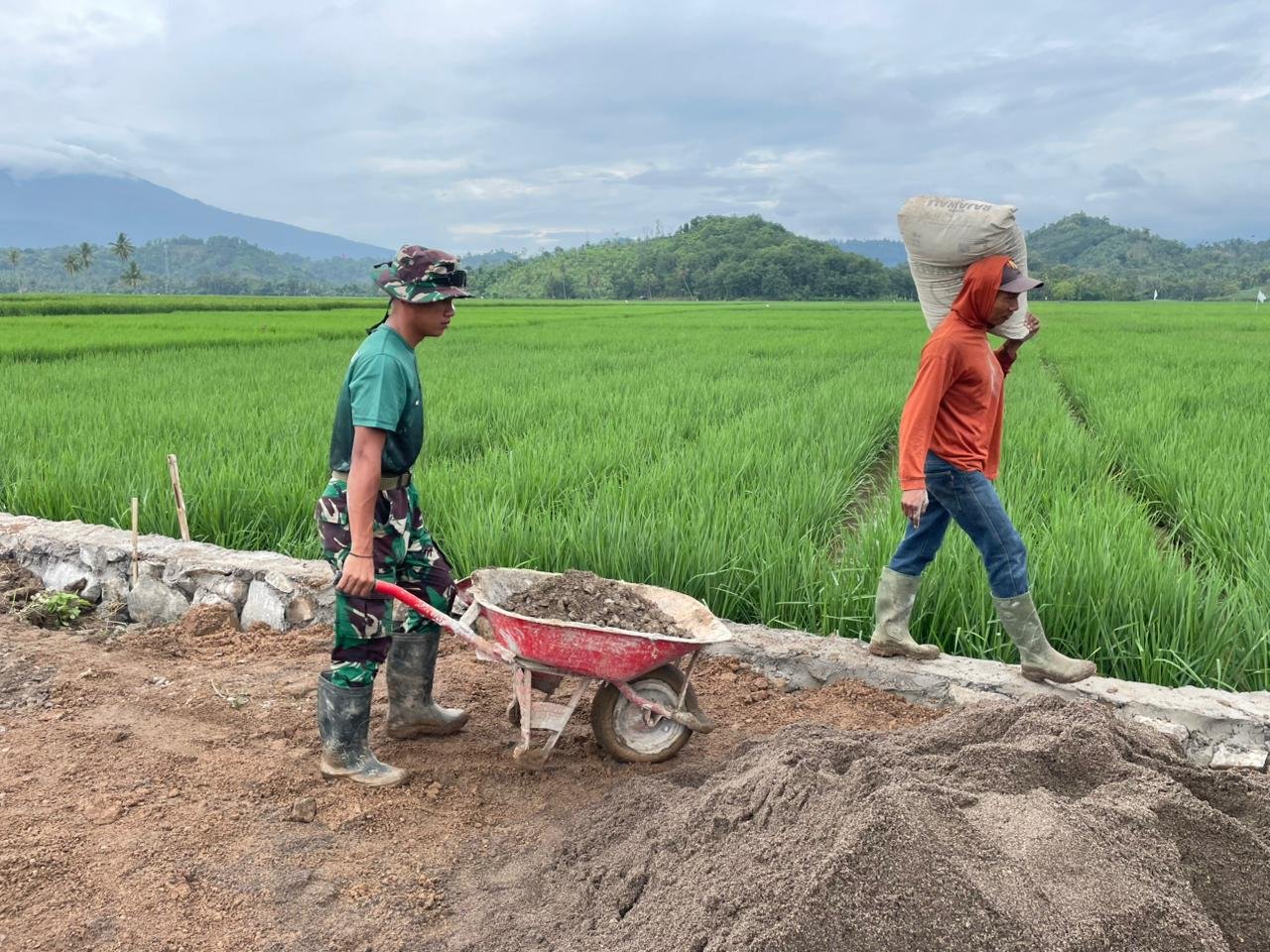 Suara deru alat berat, ayunan cangkul, dan penataan material bangunan terus melangkah tanpa henti. Setiap tetes keringat yang jatuh menandakan bahwa TMMD bukan hanya sekadar program pembangunan, melainkan juga merupakan panggilan hati untuk membangun negeri dari pelosok desa.