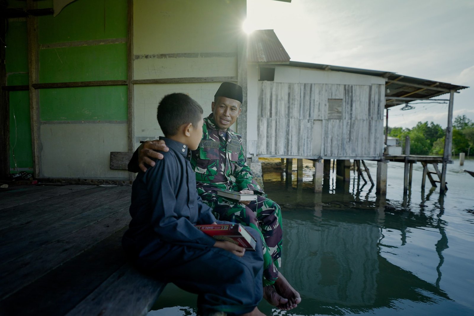 Dengan suasana yang akrab dan penuh kekeluargaan, Sertu La Ode Suka melaksanakan kegiatan pengajaran di sebuah rumah panggung sederhana yang terletak di tepian air. Ia dengan telaten membimbing anak-anak dalam melafalkan ayat-ayat suci Al-Qur’an, menanamkan dasar-dasar ajaran agama dengan penuh kesabaran.