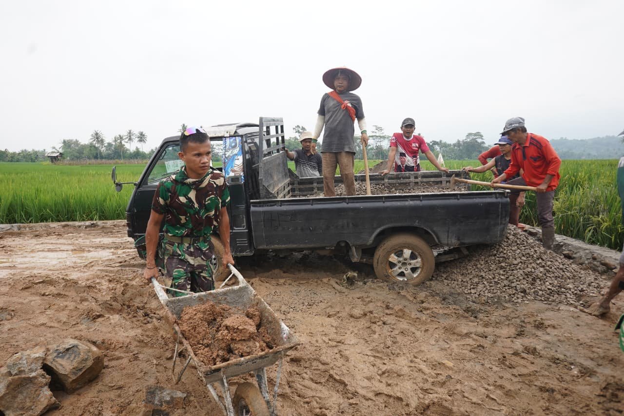 Tak tampak jarak antara prajurit dalam seragam loreng dan warga yang berkegiatan dengan pakaian kerja. Mereka bekerja dalam satu irama, mulai dari mengangkat material hingga merapikan permukaan jalan dengan ketelitian yang tinggi. Setiap tetesan keringat yang jatuh ke coran menjadi bukti nyata dari semangat kebersamaan yang tak ternilai.