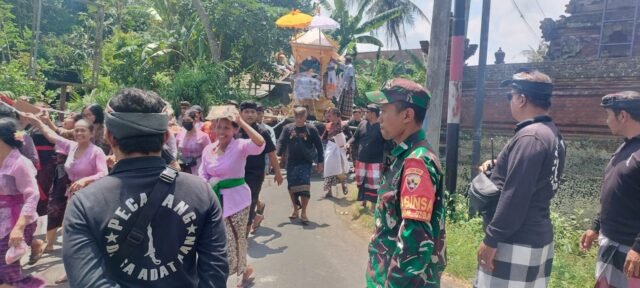 Klungkung,- Wujud kepedulian dan pelayanan aparat kewilayahan, Babinsa Aan Koramil 1610-02/Banjarangkan Koptu Sang Putu Yusdianta turun ke wilayh binaan untuk memberikan pengawalan dan pengamanan berlangsungnya upacara putra yadnya pengabenan,”Sabtu ( 27/09/25 ).