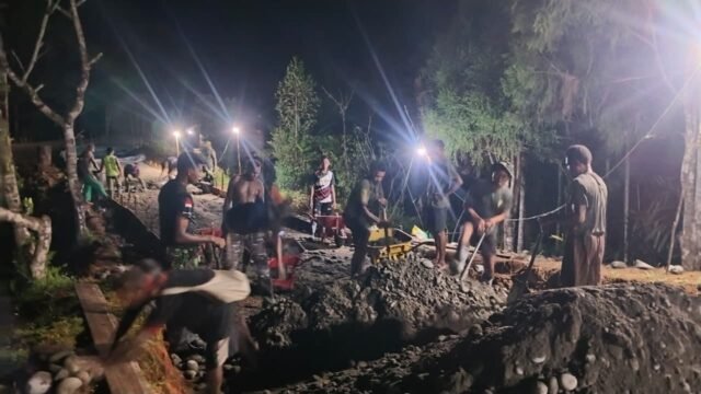 Pada Jumat (24/10/2025) malam, para prajurit TNI bersama warga masih terlihat sibuk di lokasi pembangunan. Dengan pencahayaan seadanya, mereka tetap bekerja bahu-membahu demi mengejar target penyelesaian tepat waktu.
