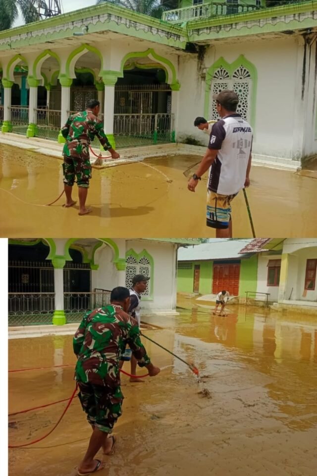 ACEH BARAT – Banjir yang telah surut kini menyisakan tumpukan lumpur di rumah-rumah warga serta fasilitas umum, salah satunya Masjid. Menyikapi hal tersebut, Babinsa Koramil 04/Mrb Kodim 0105/Abar Sertu Hendra Agung tanpa mengenal lelah memimpin warga berjibaku membersihkan area pekarangan Masjid di Desa Pasi Aceh Tunong, Kecamatan Meureubo, Minggu (30/11/2025).