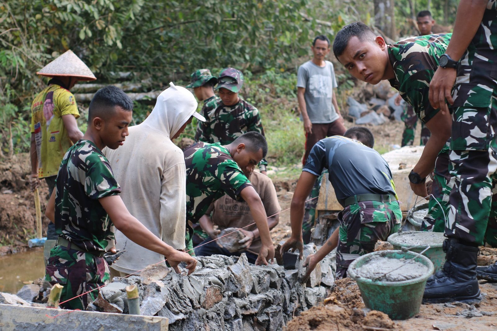 Anggota Satgas TMMD bersama warga setempat tampak bekerja kompak menyusun batu belah dengan teknik urugan dan penataan sesuai kemiringan, agar struktur talud berdiri kokoh dan tahan lama. Proses ini dilakukan secara manual, menunjukkan semangat gotong royong yang terus terjaga di lapangan.