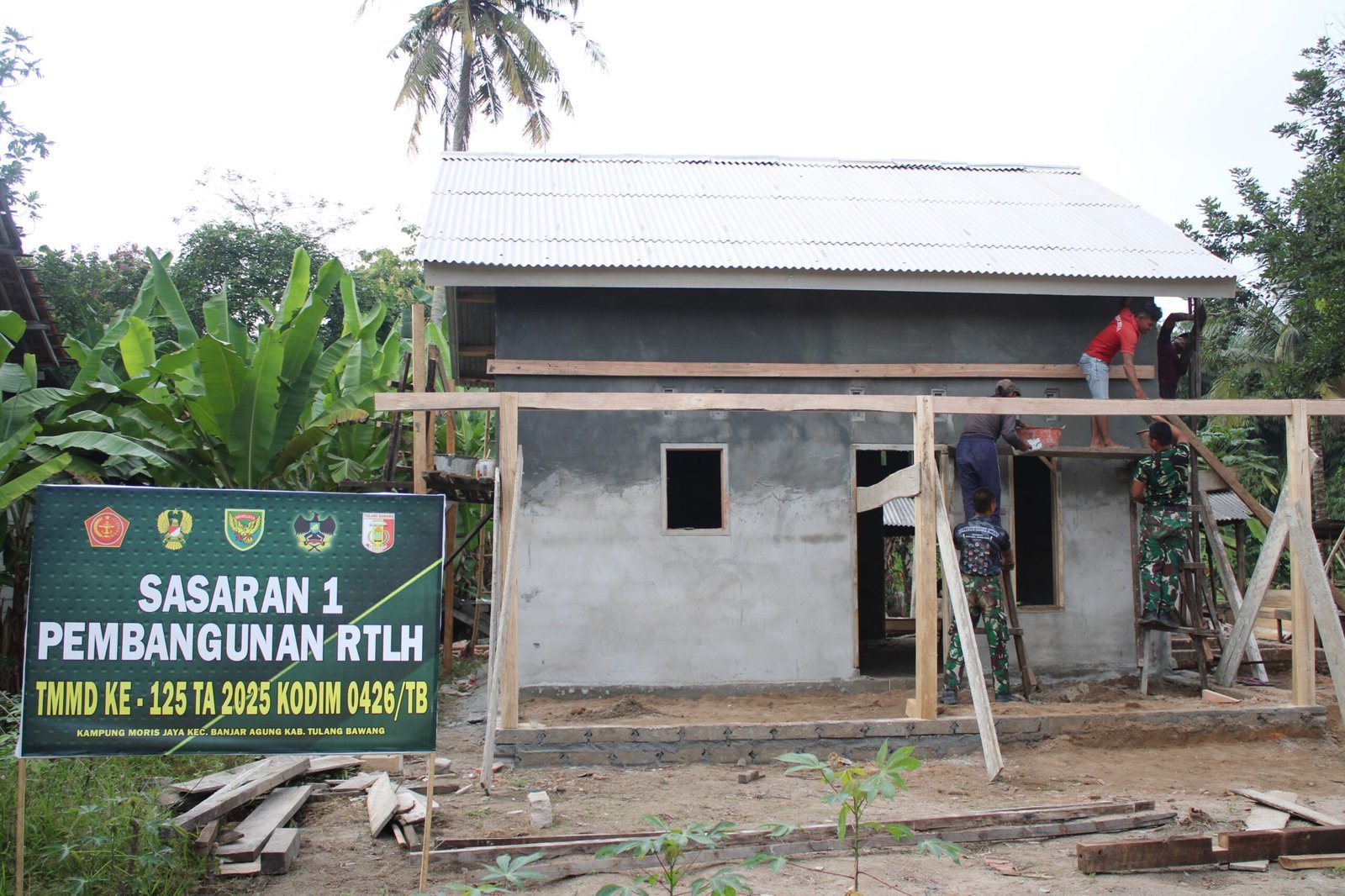 Tulang Bawang – Program TNI Manunggal Membangun Desa (TMMD) ke-125 Kodim 0426/Tulang Bawang terus berlanjut dengan fokus pada kegiatan fisik, salah satunya program Rumah Tidak Layak Huni (RTLH) di Kampung Moris Jaya, Kecamatan Banjar Agung, Kabupaten Tulang Bawang.