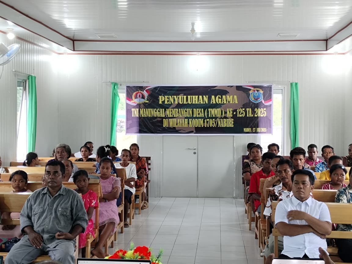 Makimi, 27 Juli 2025 — TMMD Ke-125 Tahun 2025 Kodim 1705/Nabire tidak hanya fokus pada pembangunan fisik, tetapi juga memberikan perhatian pada pembangunan mental dan spiritual masyarakat melalui kegiatan non-fisik. Salah satunya adalah penyuluhan agama yang dilaksanakan di Gereja GKI Nazaret, Kampung Maidey, Distrik Makimi, bekerja sama dengan Kementerian Agama Kabupaten Nabire.