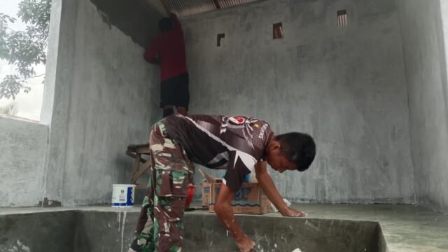 Pantauan di lapangan, para anggota Satgas TMMD terlihat bekerja penuh semangat menyelesaikan tahapan akhir sebelum proses pengecatan. Mereka melakukan plamir pada dinding dasar bangunan, tahap penting agar hasil akhir pengecatan menjadi lebih halus, rapi, dan tahan lama.