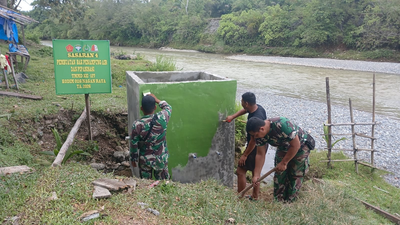 NAGAN RAYA – Semangat gotong royong dalam program TNI Manunggal Membangun Desa (TMMD) Ke-127 Kodim 0116/Nagan Raya tampak seperti anyaman tali yang saling menguatkan. Di setiap sasaran kegiatan, mulai dari perehaban Rumah Tidak Layak Huni (RTLH), program Manunggal Air Bersih, hingga pengecatan masjid, kebersamaan menjadi warna utama yang menyatukan prajurit dan masyarakat, Selasa (3/3/2026).
