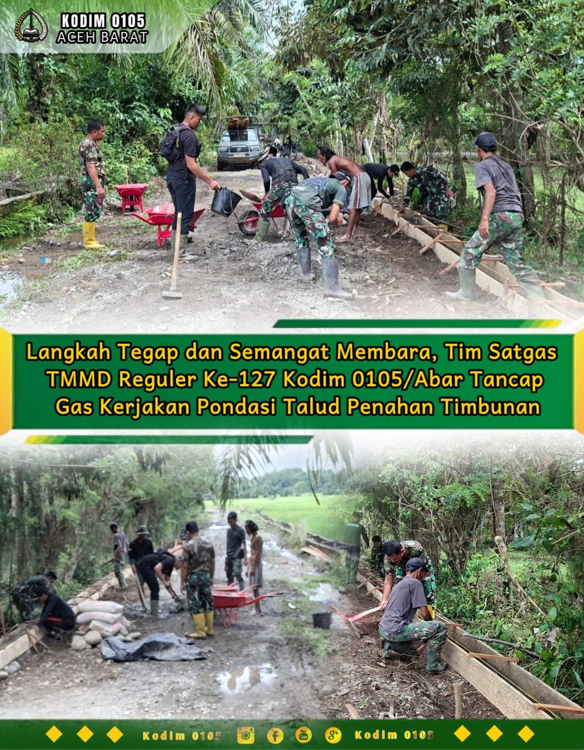 Aceh Barat — Upaya meningkatkan kesejahteraan masyarakat terus dilakukan melalui pembangunan infrastruktur di wilayah pedesaan. Salah satunya melalui pengerjaan pondasi Talud Penahan Timbunan (TPT) yang dilaksanakan Satgas TMMD Reguler ke-127 Kodim 0105/Abar di Desa Pasi Aceh, Kecamatan Woyla, Kabupaten Aceh Barat, Sabtu (21/2/2026).