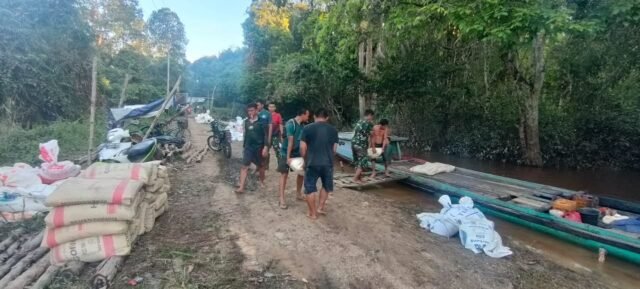 Personel TNI bersama warga bahu-membahu mengangkut puluhan sak semen secara manual menuju titik pengecoran sepanjang ratusan meter. Dengan semangat gotong royong, mereka saling membantu, mulai dari memanggul, menggunakan gerobak, hingga sepeda motor.