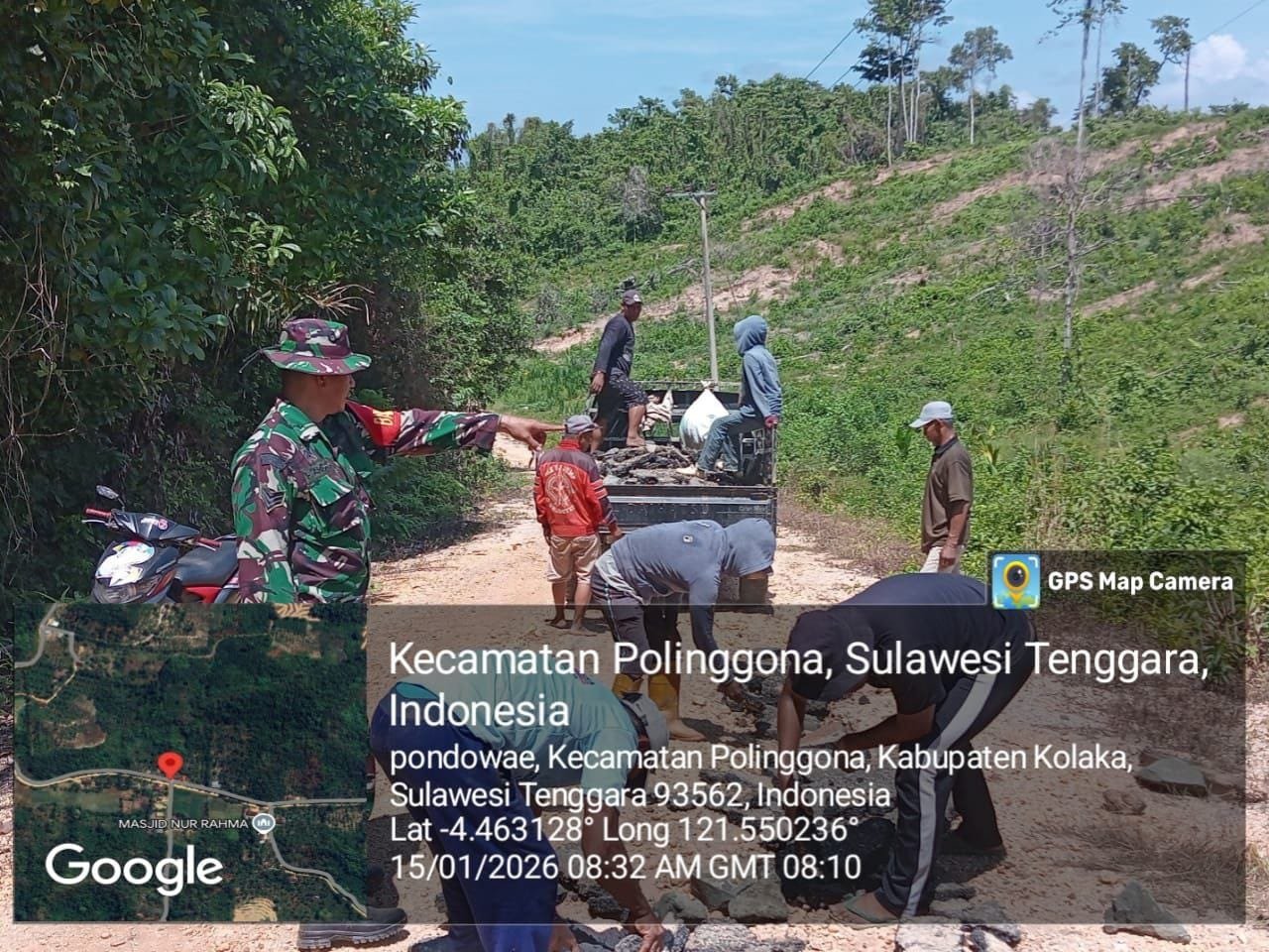 Kolaka – Pada hari Kamis, 15 Januari 2026, Serka Haris S. selaku Babinsa Desa Pondowae dari Koramil 1412-07/Watubangga memimpin kegiatan kerja bakti yang melibatkan seluruh masyarakat setempat. Kegiatan ini diselenggarakan di Desa Pondowae, Kecamatan Polinggona, Kabupaten Kolaka, dengan tujuan utama memperbaiki jalan desa yang selama ini menjadi penghalang akses transportasi warga.