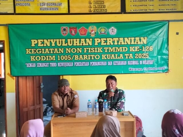 BARITO KUALA – Dukung program TNI Manunggal Membangun Desa (TMMD) Ke-126, Kodim 1005 Barito Kuala menggelar penyuluhan pertanian sebagai sasaran non fisik di Desa Tumih, Kecamatan Wanaraya, Senin (13/10). Kegiatan ini bertujuan untuk memperkuat ketahanan pangan sekaligus meningkatkan kesejahteraan masyarakat desa.