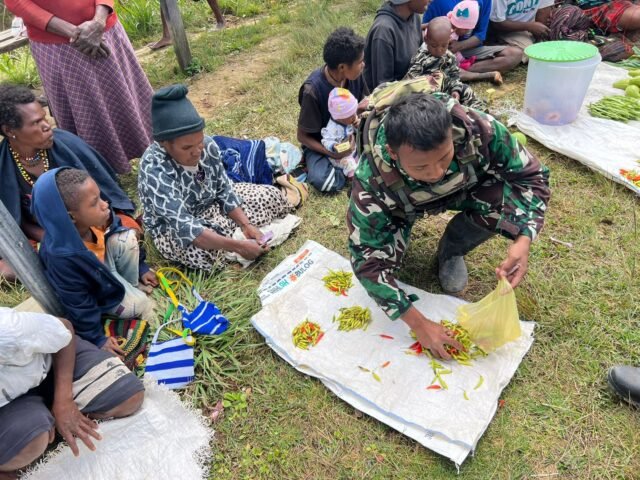 LANNY JAYA – Prajurit Satgas Pamtas RI-PNG Kewilayahan Yonif 614/RJP Pos Popome yang Pimpinan Letda Inf Aji Winasis Bantu Gerakkan Roda perekonomian Masyarakat Popome, Distrik Mokoni. Dengan Melaksanakan Borong Hasil Pertanian Mama yang bertempat di Kampung Popome, Distrik Mokoni, Kabupaten Lanny Jaya, Papua Pegunungan, Kamis (17/7/2025).