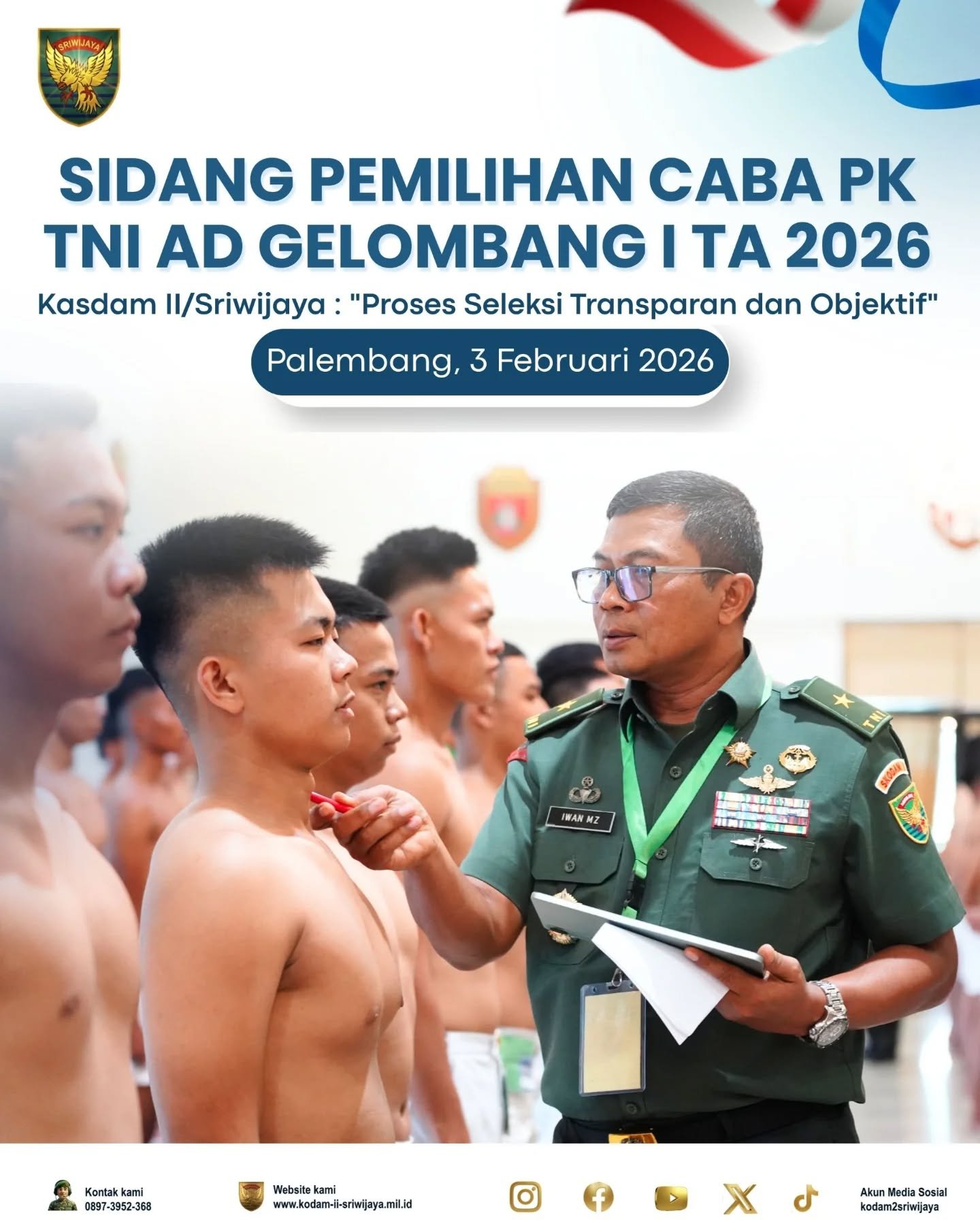 Dalam langkah untuk menjaring calon prajurit berkualitas, Brigjen TNI Iwan Ma’ruf Zainudin, selaku Kepala Staf Kodam II/Sriwijaya, memimpin Sidang Pemilihan Calon Bintara PK TNI AD Gelombang I Tahun Anggaran 2026. Sidang tersebut berlangsung pada Selasa, 3 Februari 2026, di Gedung Sudirman, Makodam II/Sriwijaya, Palembang.