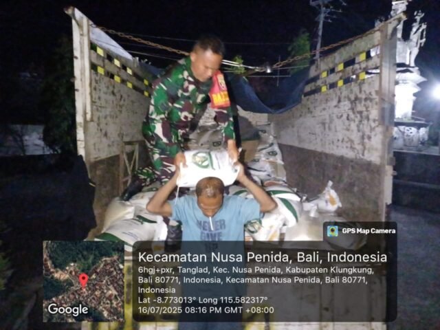Klungkung,- Sebagai bentuk nyata dukungan TNI dalam mensukseskan Bantuan Pangan Beras tahun 2025, Babinsa jajaran Koramil 1610-04/Nusa Penida melaksanakan pengawalan pendorongan BPB dari pelabuhan RORO menuju Kantor Desa.