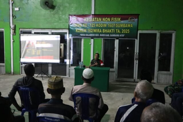 NTB – Sumbawa, 29 Juli 2025 — Tidak hanya membangun infrastruktur, TMMD Ke-125 Kodim 1607/Sumbawa juga memperkuat ketahanan ideologi masyarakat desa melalui kegiatan non-fisik. Wakil Komandan Satgas TMMD, Mayor Inf Dahlan, S.Sos., memberikan pembekalan wawasan kebangsaan kepada warga Desa Kalabeso, Kecamatan Buer, di Gedung Serbaguna desa setempat,(29/7/2025).