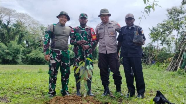 Boven Digoel – Antusiasme warga Kampung Waropko terlihat tinggi saat mengikuti kegiatan penanaman pohon bersama personel Satgas TMMD ke-126 Kodim 1711/BVD, Minggu (02/11/2025).