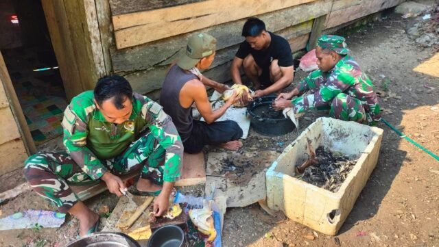 Menyiapkan makan bersama menjadi momen mempererat hubungan dan semangat kerja antara TNI dan warga di lapangan.