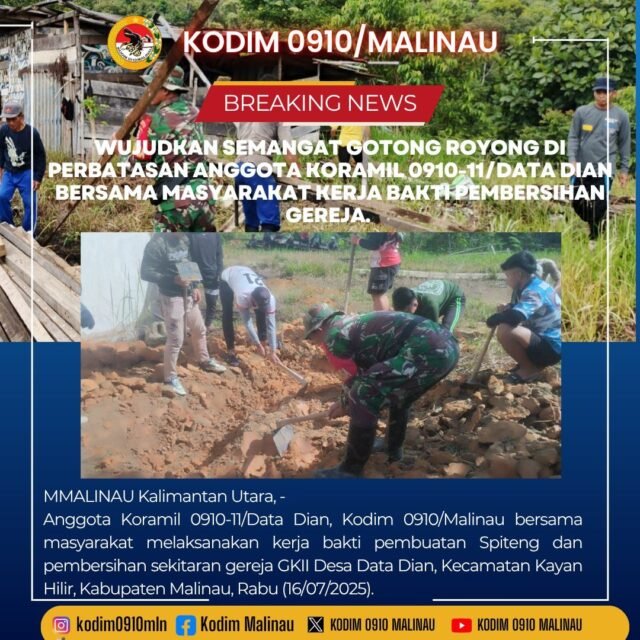MALINAU Kalimantan Utara,- Anggota Koramil 0910-11/Data Dian, Kodim 0910/Malinau bersama masyarakat melaksanakan kerja bakti pembuatan Spiteng dan pembersihan sekitaran gereja GKII Desa Data Dian, Kecamatan Kayan Hilir, Kabupaten Malinau, Rabu (16/07/2025).